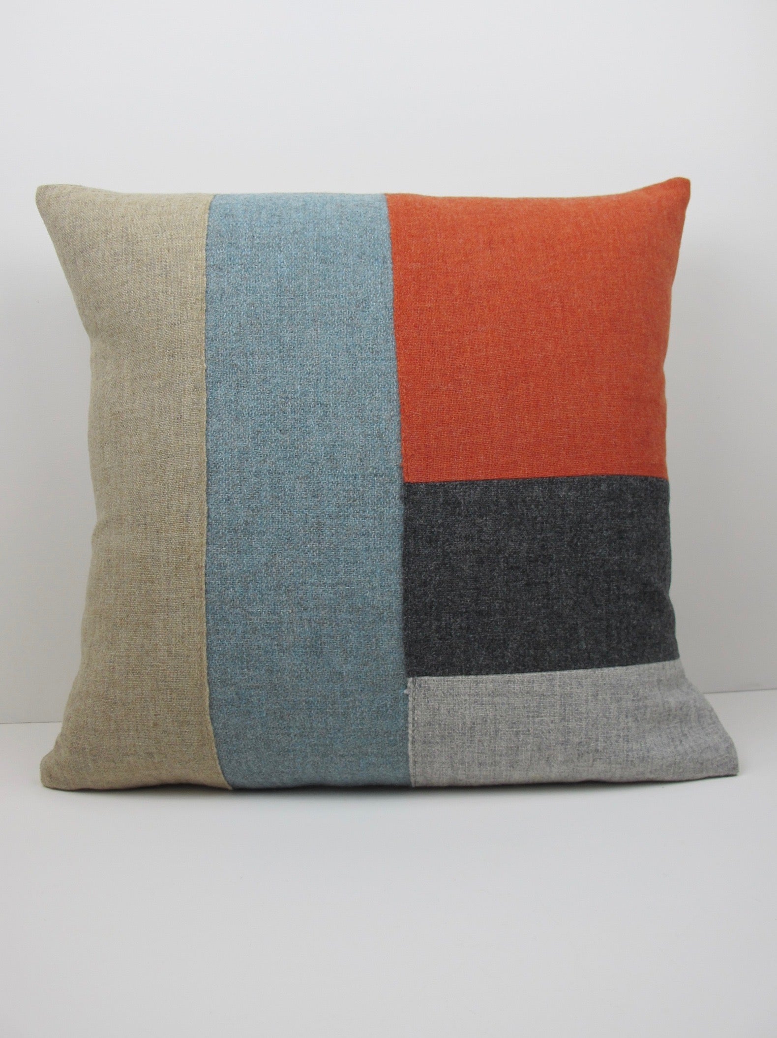 Made from traditionally woven Welsh flannel in seville, straw, silver grey, mid grey and duck egg. 100% wool. Generous overlap envelope back in contrasting single colour flannel.