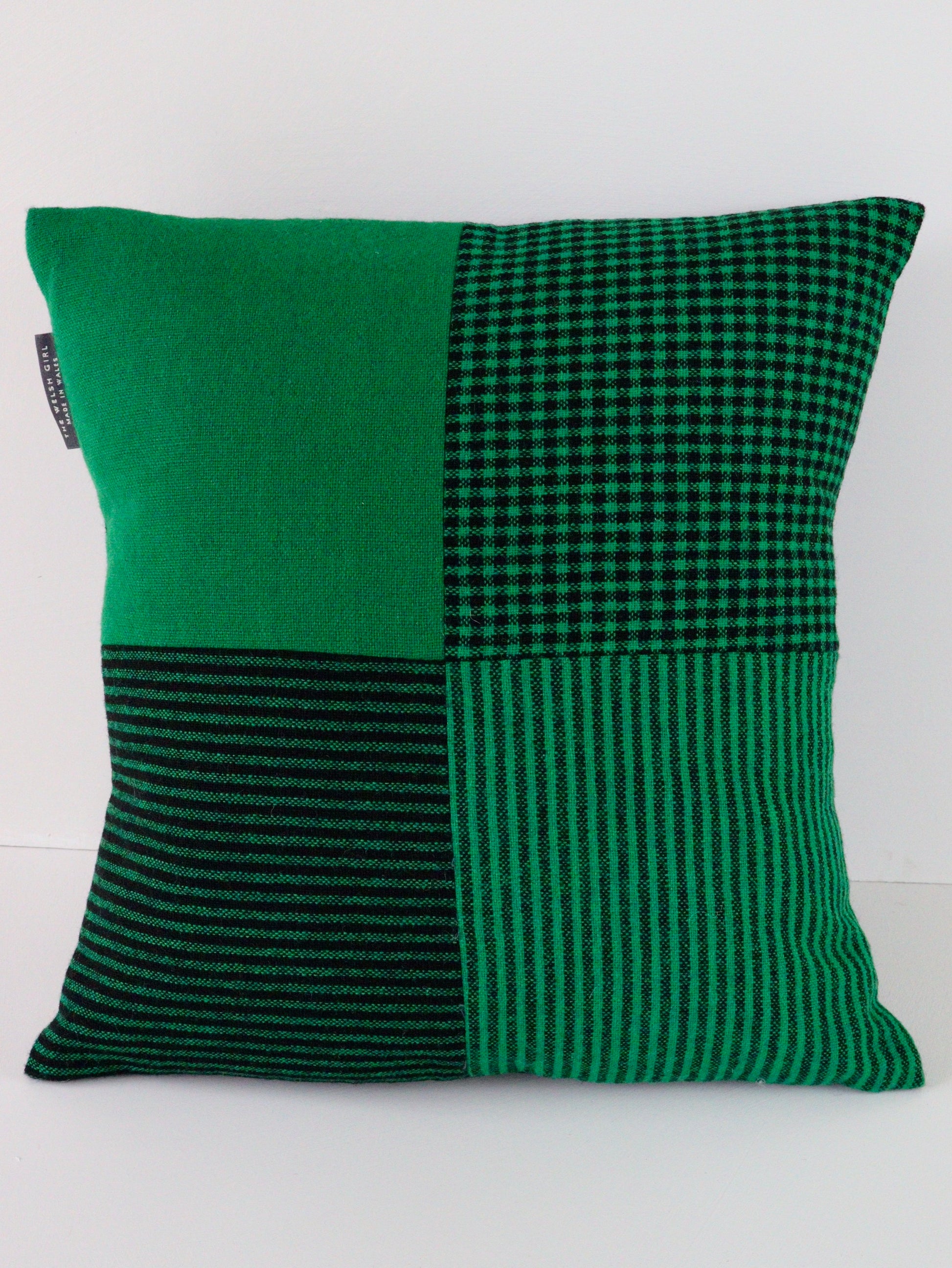 A modern take on tradition. One of a kind handmade cushions at home in any environment. Made from heritage Welsh flannel. 100% wool. Generous overlap envelope back in emerald flannel.