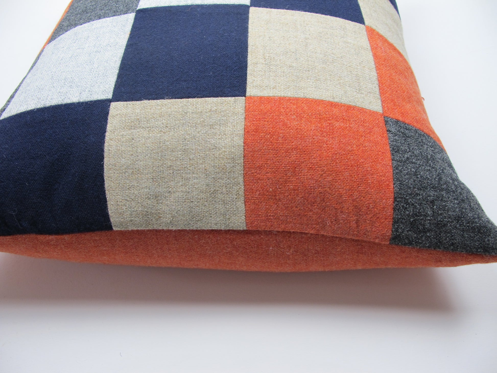 Made from traditionally woven Welsh flannel in seville, straw, silver grey, mid grey and navy. 100% wool. Generous overlap envelope back in contrasting single colour flannel.