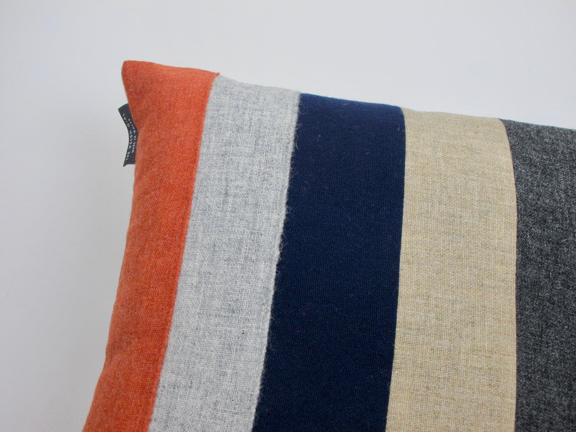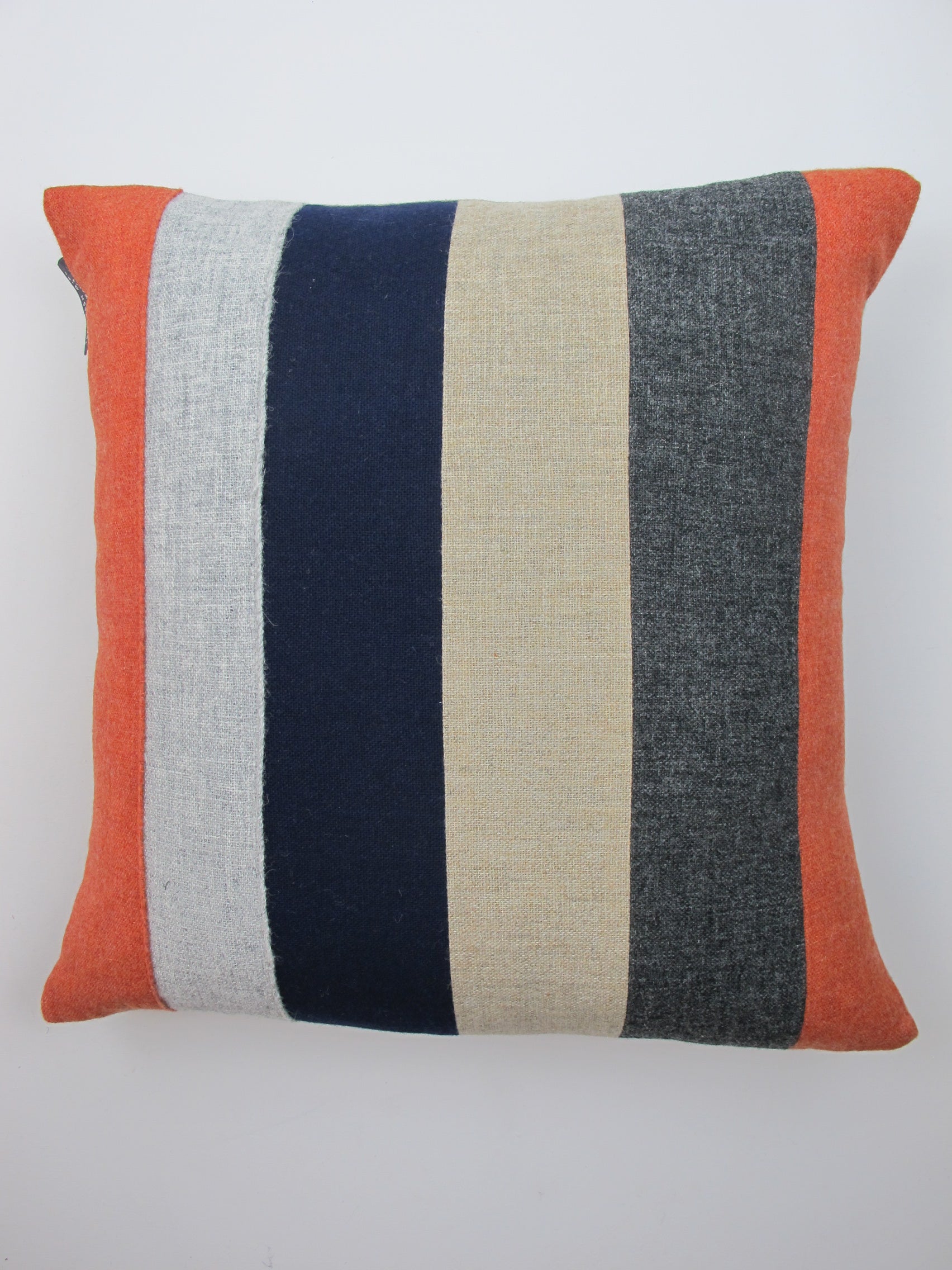 Made from traditionally woven Welsh flannel in seville, straw, silver grey, mid grey and navy. 100% wool. Generous overlap envelope back in contrasting single colour flannel.
