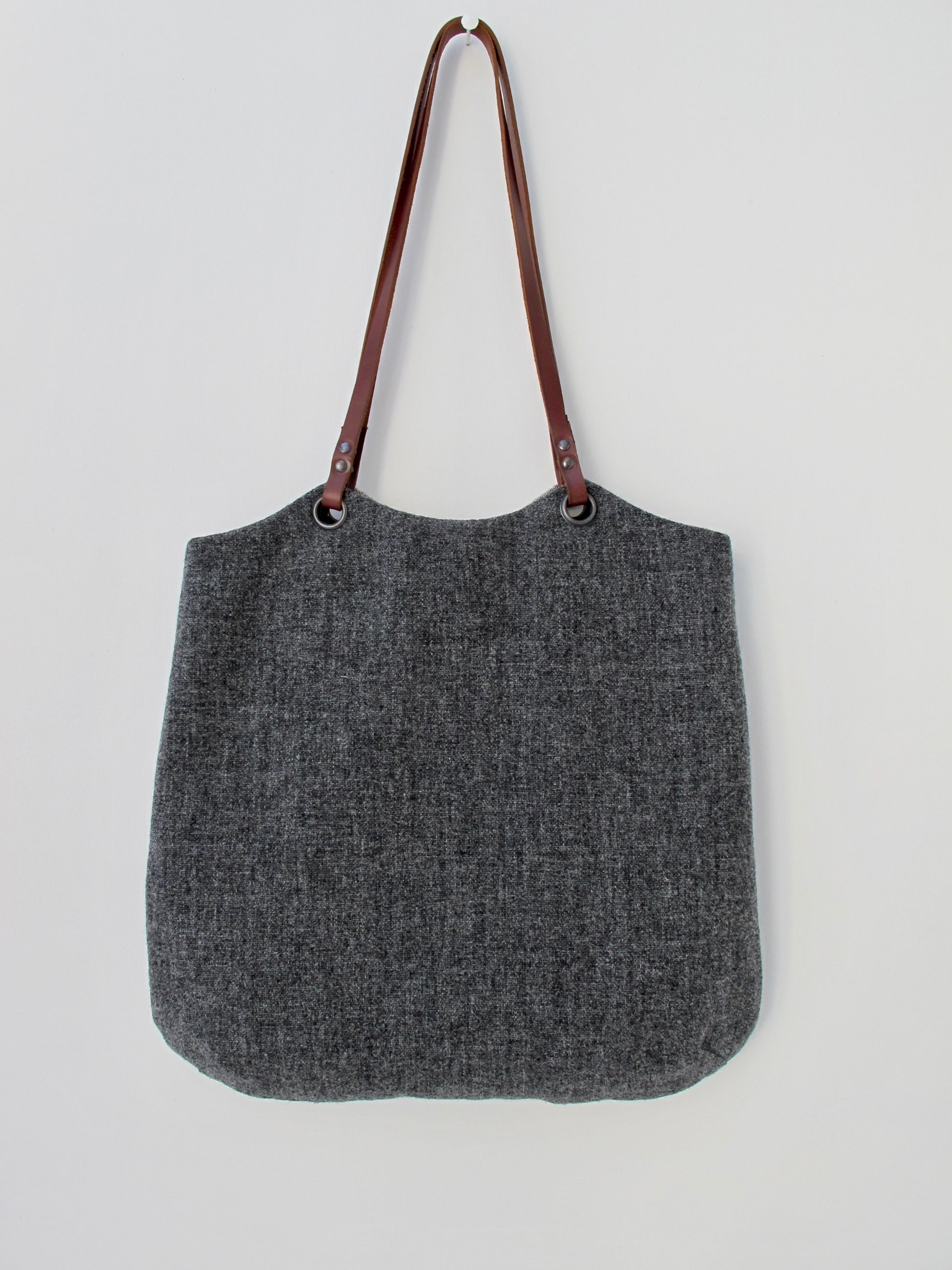 Unique, reversible, practical blockwork tote; can be worn over the shoulder or carried in your hand. Each bag is handcrafted from traditional Welsh flannel (wool) and only three of a kind are made; one side is blockwork in shades of grey, red and heritage black and grey stripe while the other side is a plain charcoal grey; sturdy natural tanned bridle leather handles; fully lined in workwear denim; interior pockets for phone and keys; solid oxidised brass hardware that’s used for making sails.