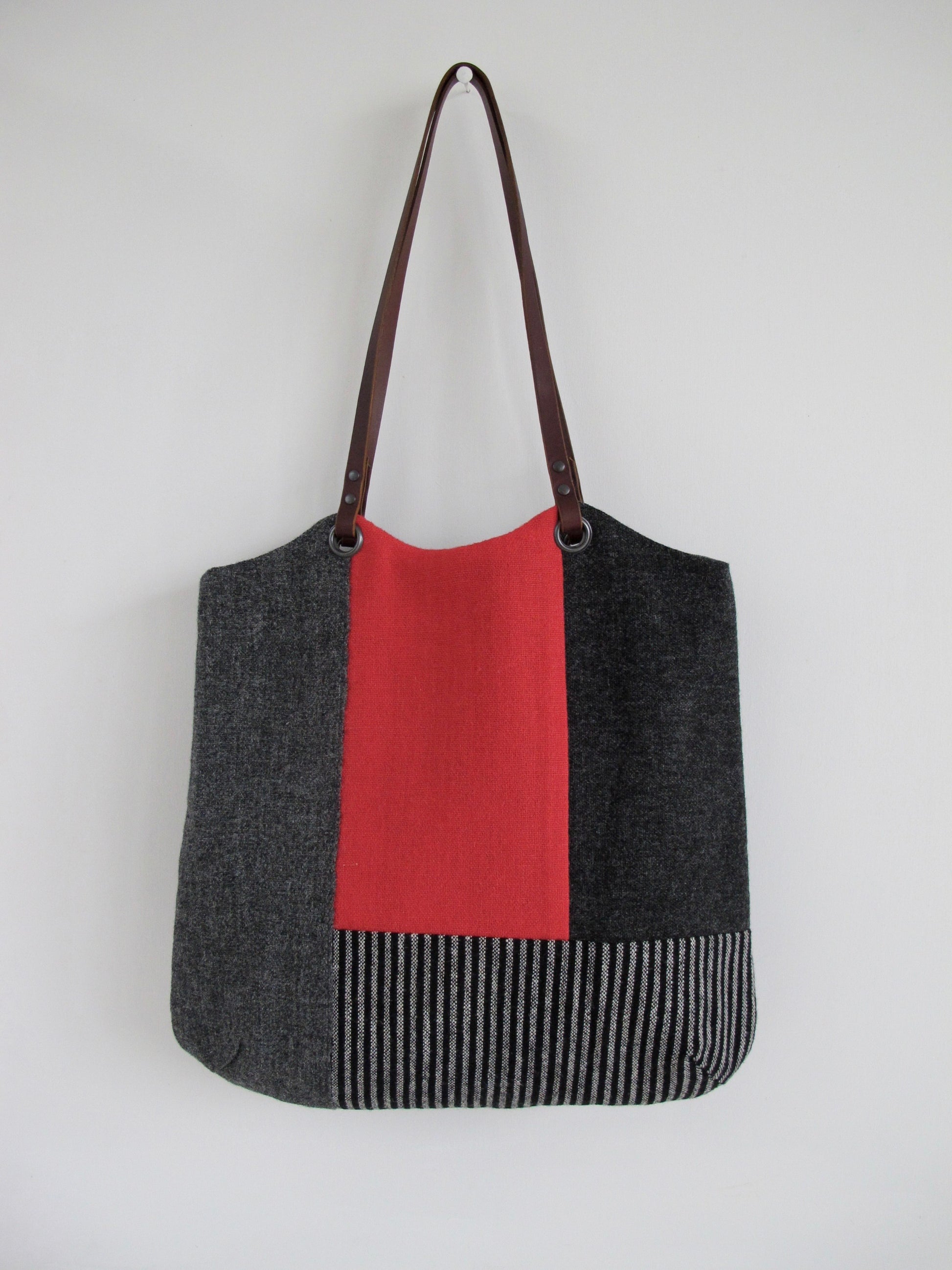 Blockwork Tote Bag - shades of grey, red and heritage stripe block I