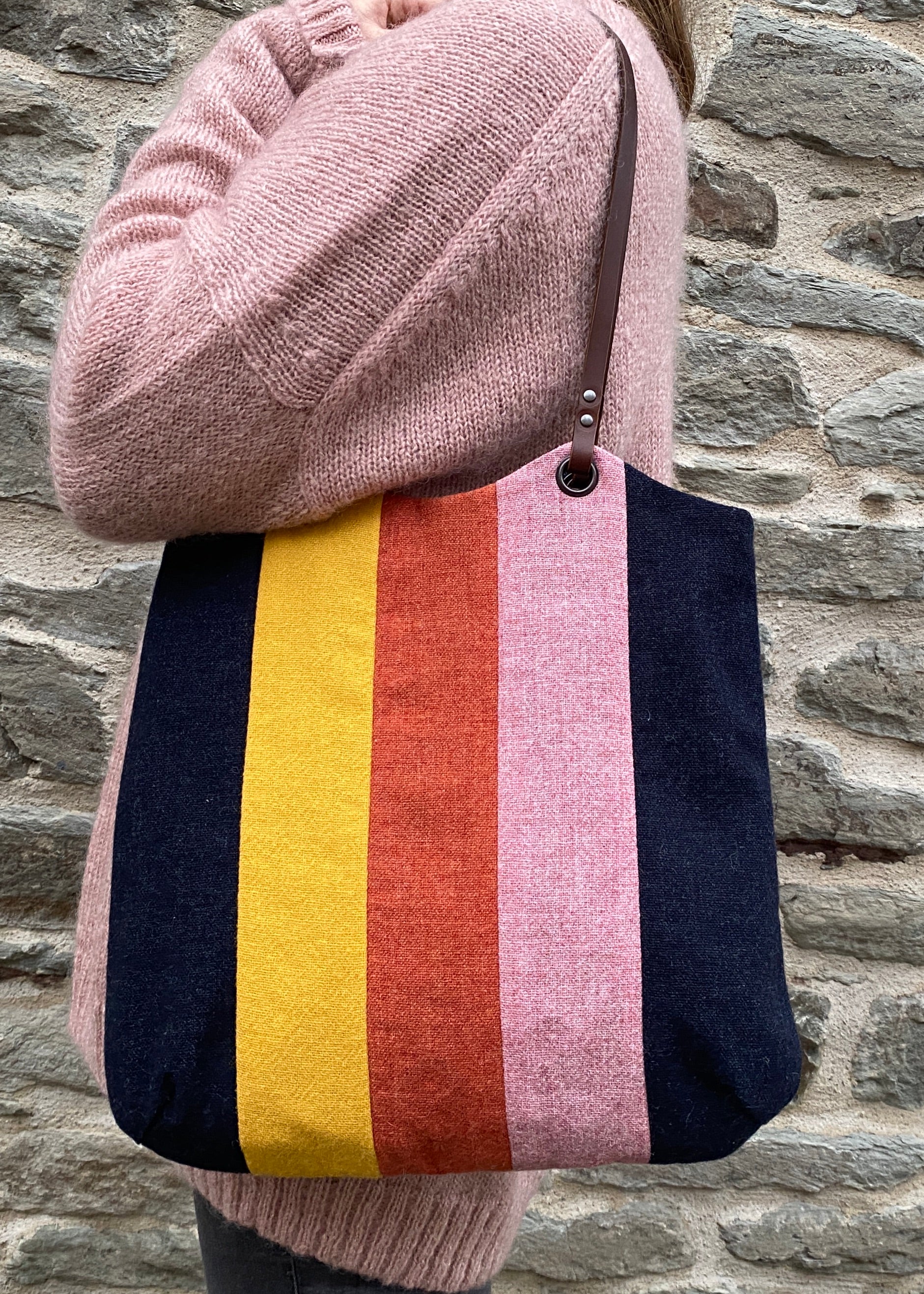 Unique, reversible, practical tote; can be worn over the shoulder or carried in your hand. Each bag is handcrafted from traditional Welsh flannel (wool); one side is blockwork and the other side in dark indigo; sturdy natural tanned bridle leather handles; fully lined in workwear denim; interior pockets for easy access to everyday essentials; solid oxidised brass hardware that’s used for making sails.