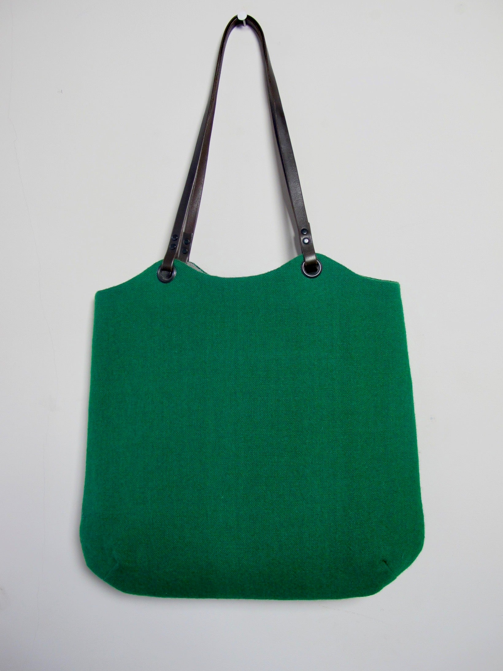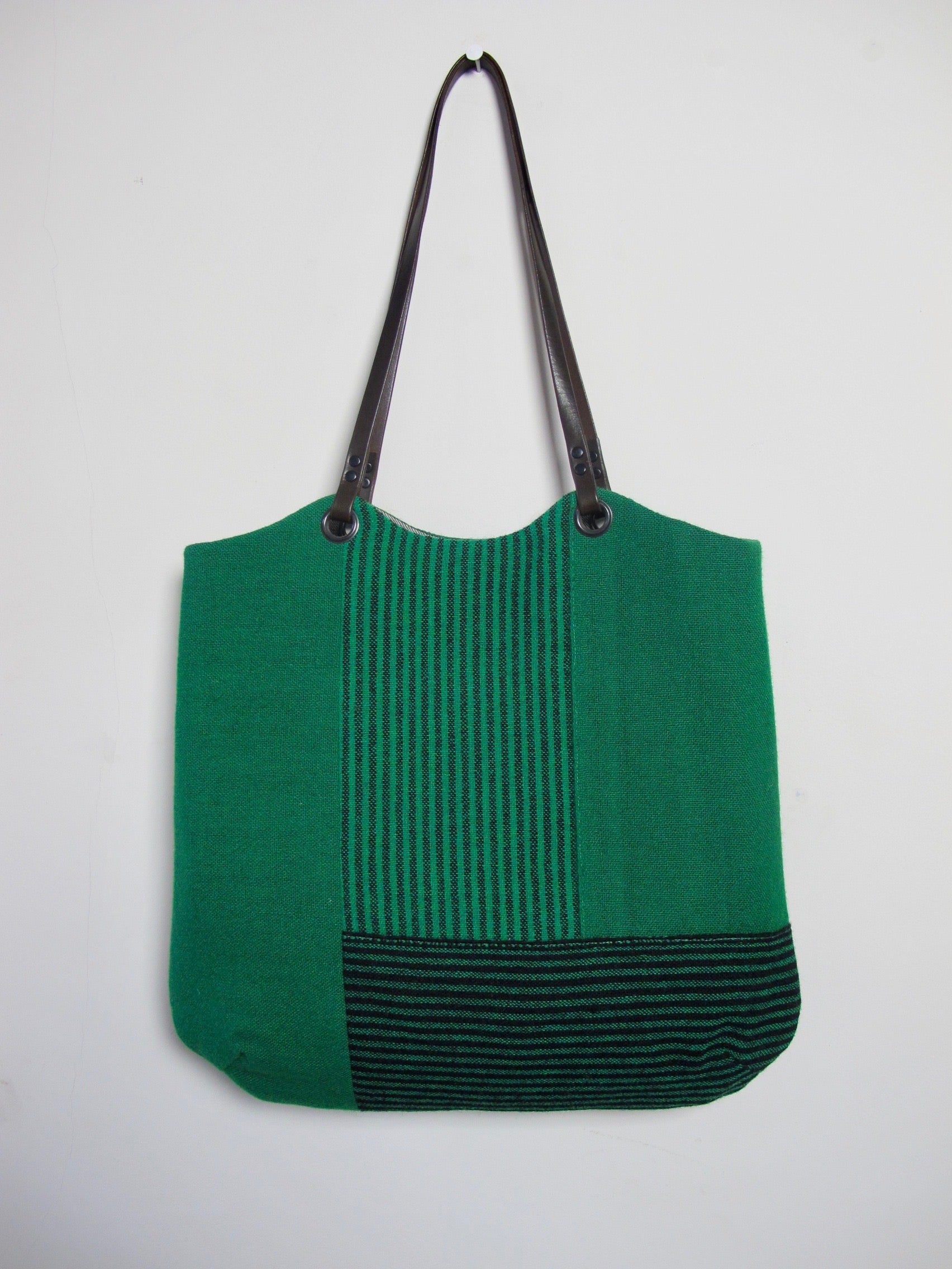 Unique, reversible, practical tote; can be worn over the shoulder or carried in your hand. Each bag is handcrafted from traditional Welsh flannel (wool) and only three of a kind are made; one side is blockwork and the other side is plain; sturdy natural tanned bridle leather handles; fully lined in workwear denim; interior pocket for phone or keys; solid oxidised brass hardware that’s used for making sails.