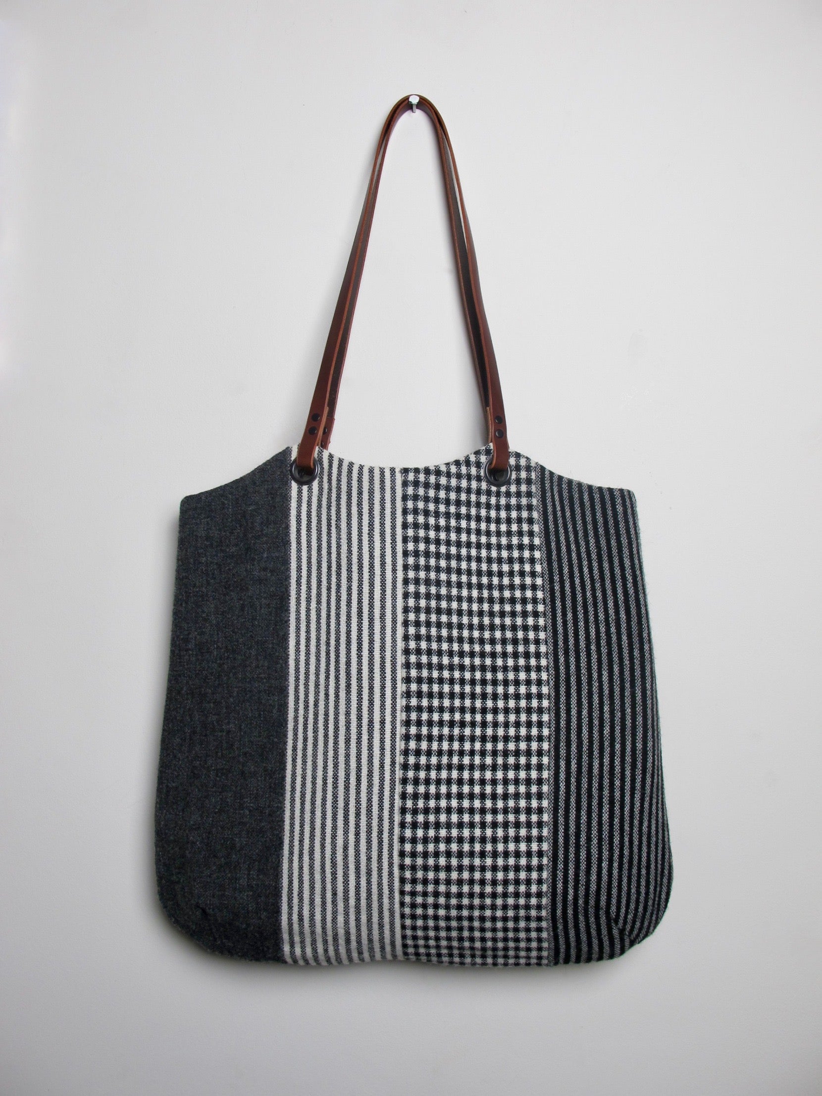 Unique, reversible, practical tote; can be worn over the shoulder or carried in your hand. Each bag is handcrafted from traditional Welsh flannel (wool); one side is blockwork and the other side is plain; sturdy natural tanned bridle leather handles; fully lined in workwear denim; interior pocket for small items, phone or keys; solid oxidised brass hardware that’s used for making sails.