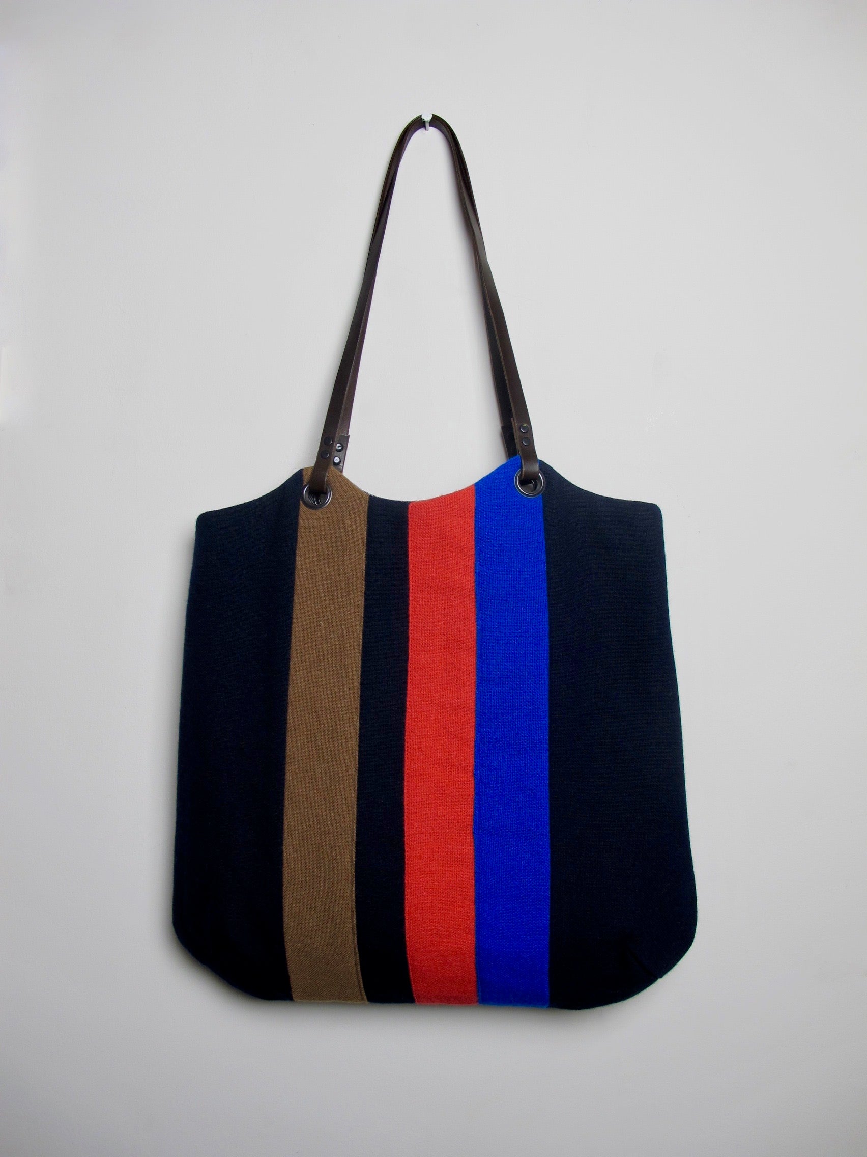 Unique, reversible, practical tote; can be worn over the shoulder or carried in your hand. Each bag is handcrafted from traditional Welsh flannel (wool) and only three of a kind are made; one side is blockwork and the other side is plain; sturdy natural tanned bridle leather handles; fully lined in workwear denim; interior pocket for phone or keys; solid oxidised brass hardware that’s used for making sails.