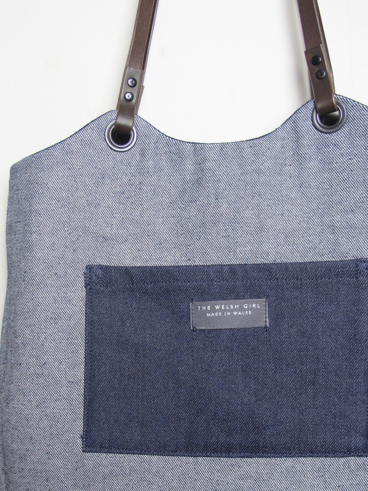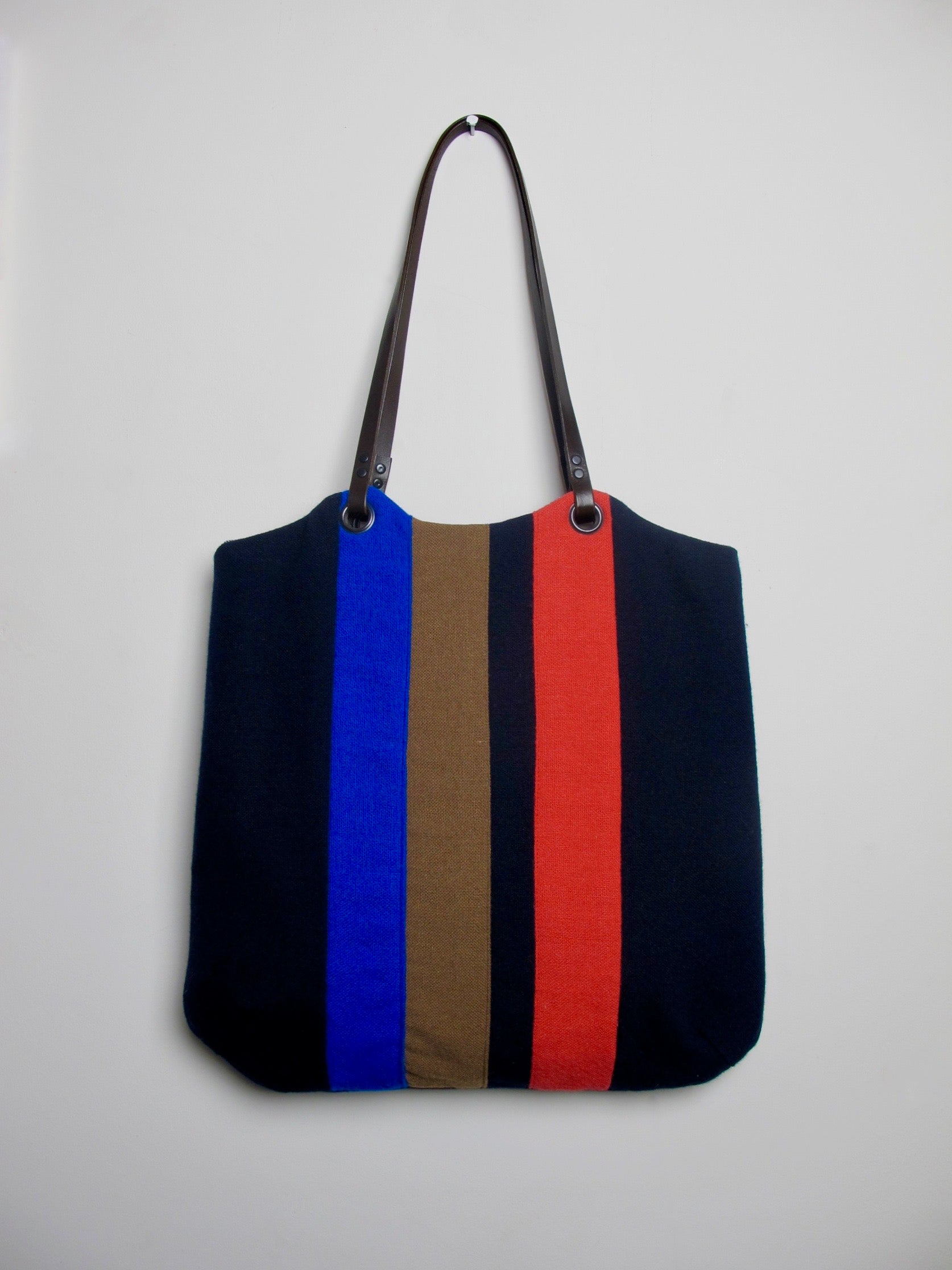 Unique, reversible, practical tote; can be worn over the shoulder or carried in your hand. Each bag is handcrafted from traditional Welsh flannel (wool) and only three of a kind are made; one side is blockwork and the other side is plain; sturdy natural tanned bridle leather handles; fully lined in workwear denim; interior pocket for phone or keys; solid oxidised brass hardware that’s used for making sails.