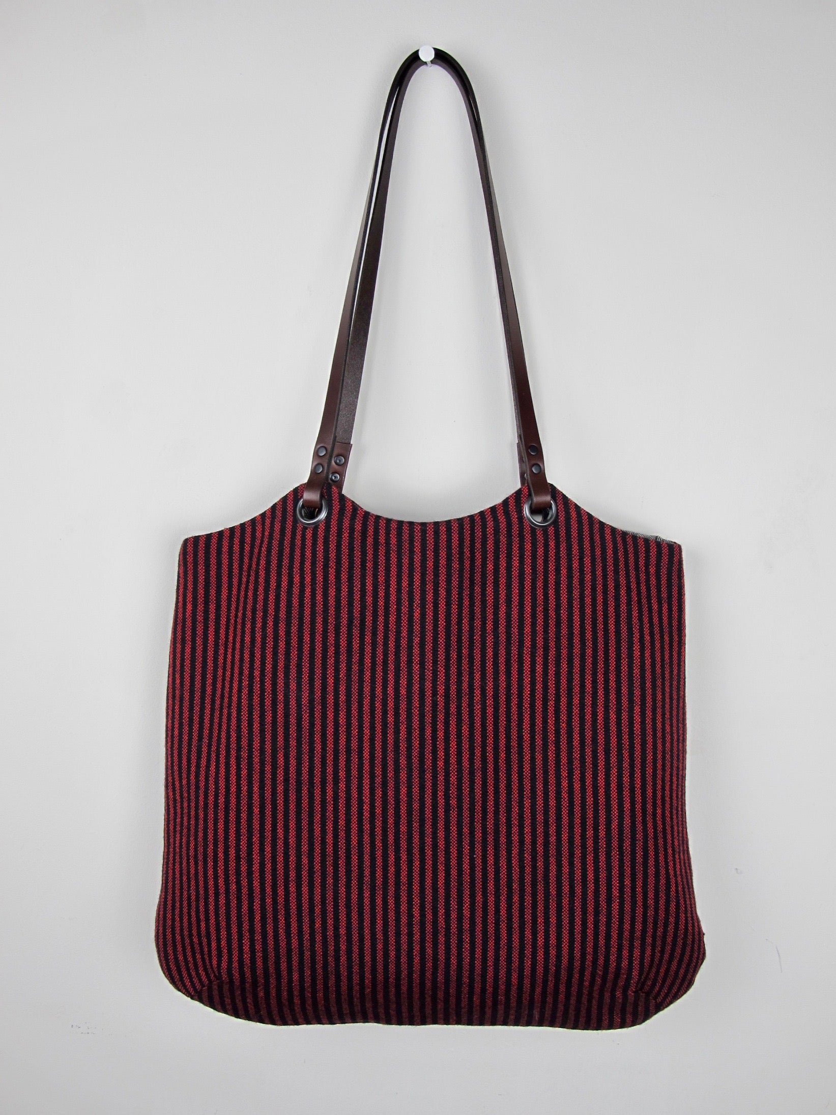 Unique and practical tote in heritage red and black stripe; can be worn over the shoulder or carried in your hand. Each bag is handcrafted from traditional Welsh flannel (wool) and only three of a kind are made; sturdy natural tanned bridle leather handles; fully lined in workwear denim; interior pockets for phone and keys; solid oxidised brass hardware that’s used for making sails.