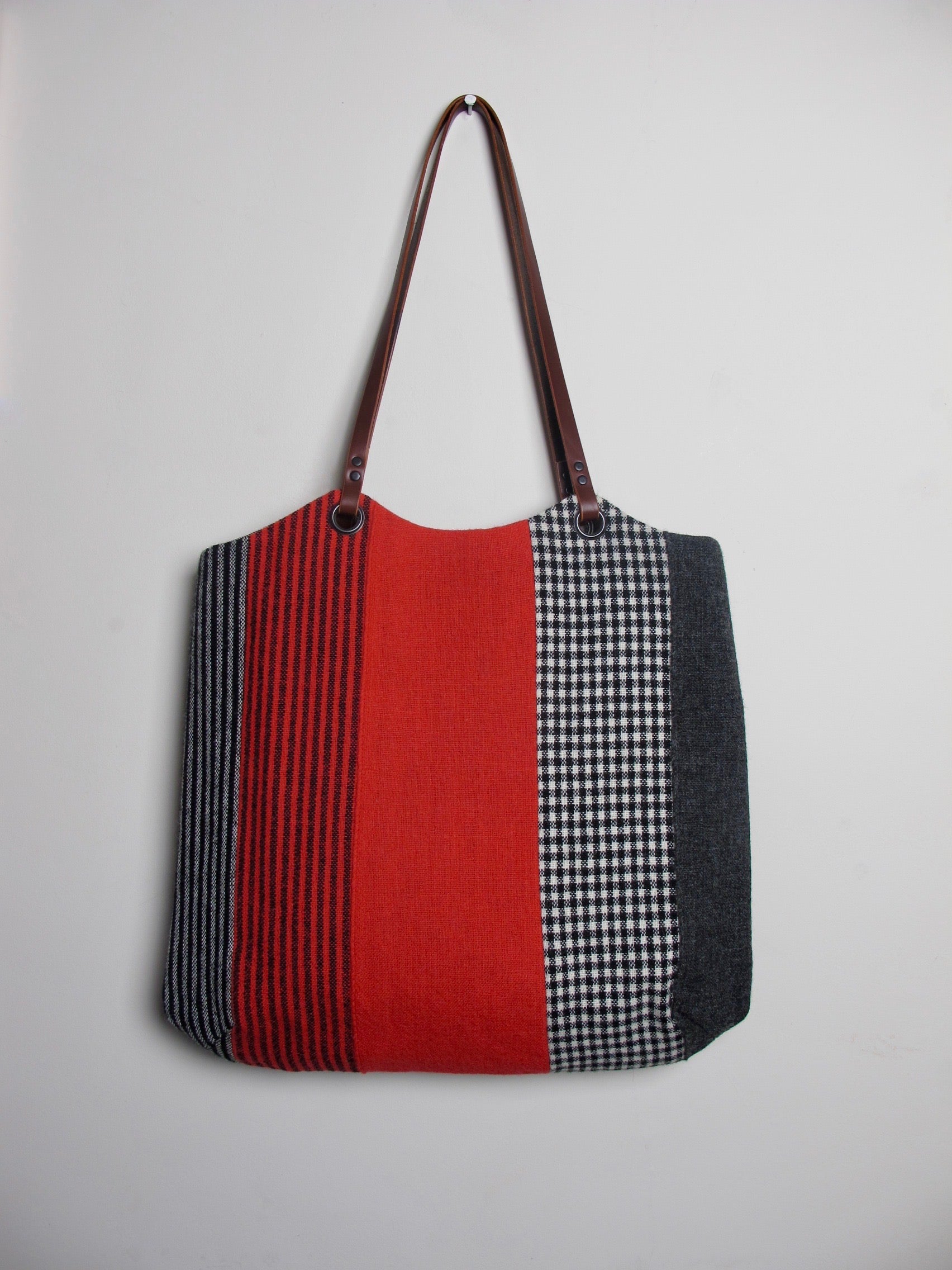 Unique, reversible, practical tote; can be worn over the shoulder or carried in your hand. Each bag is handcrafted from traditional Welsh flannel (wool) and only a few of a kind are made; one side is blockwork and the other side is plain; sturdy natural tanned bridle leather handles; fully lined in workwear denim; interior pockets for phone or keys; solid oxidised brass hardware that’s used for making sails.