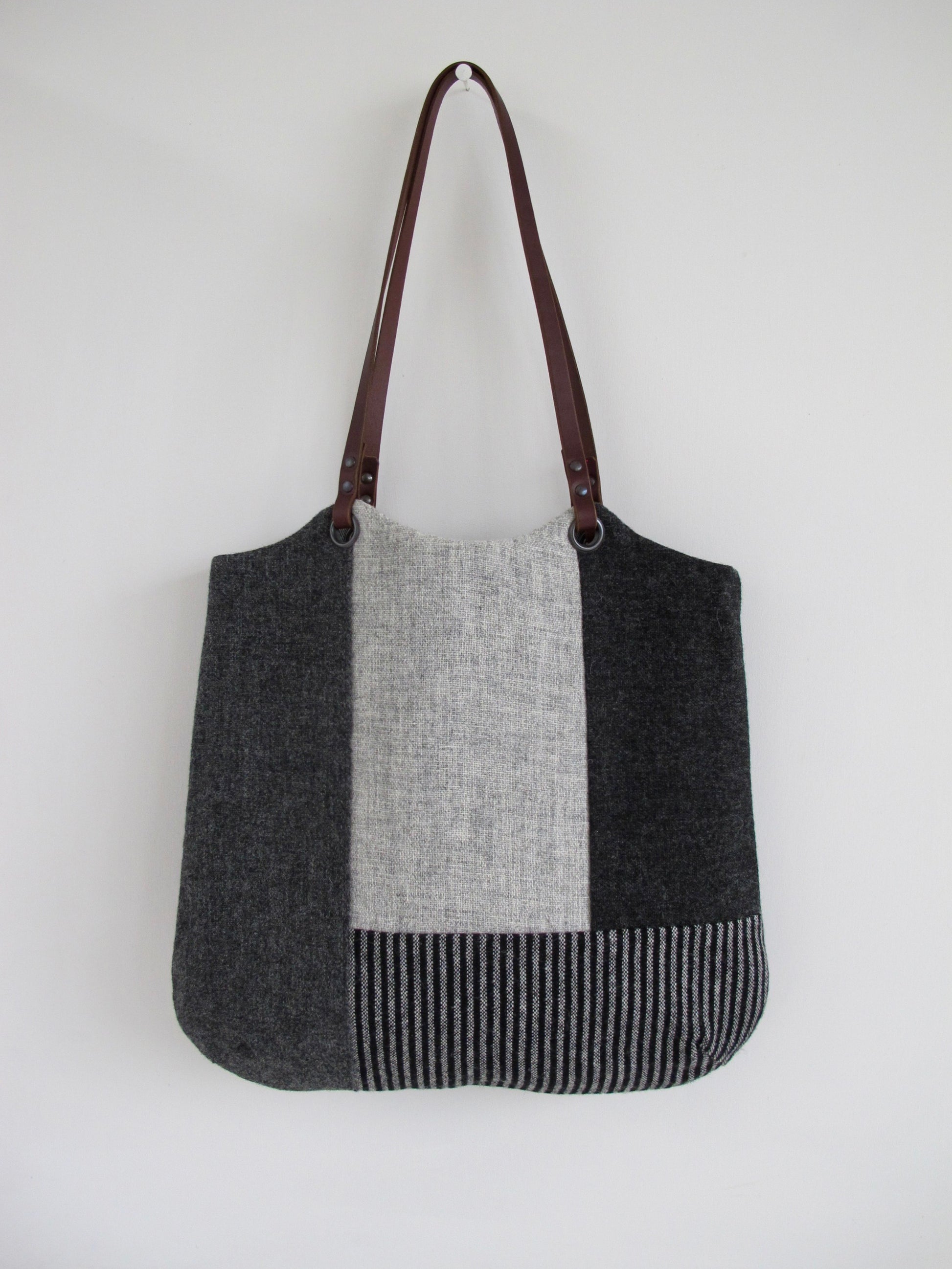 Unique, reversible, practical tote; can be worn over the shoulder or carried in your hand. Each bag is handcrafted from traditional Welsh flannel (wool) and only three of a kind are made; one side is blockwork in three shades of grey and heritage black and grey stripe while the other side is a plain charcoal grey; sturdy natural tanned bridle leather handles; fully lined in workwear denim; interior pockets for phone and keys; solid oxidised brass hardware that’s used for making sails.